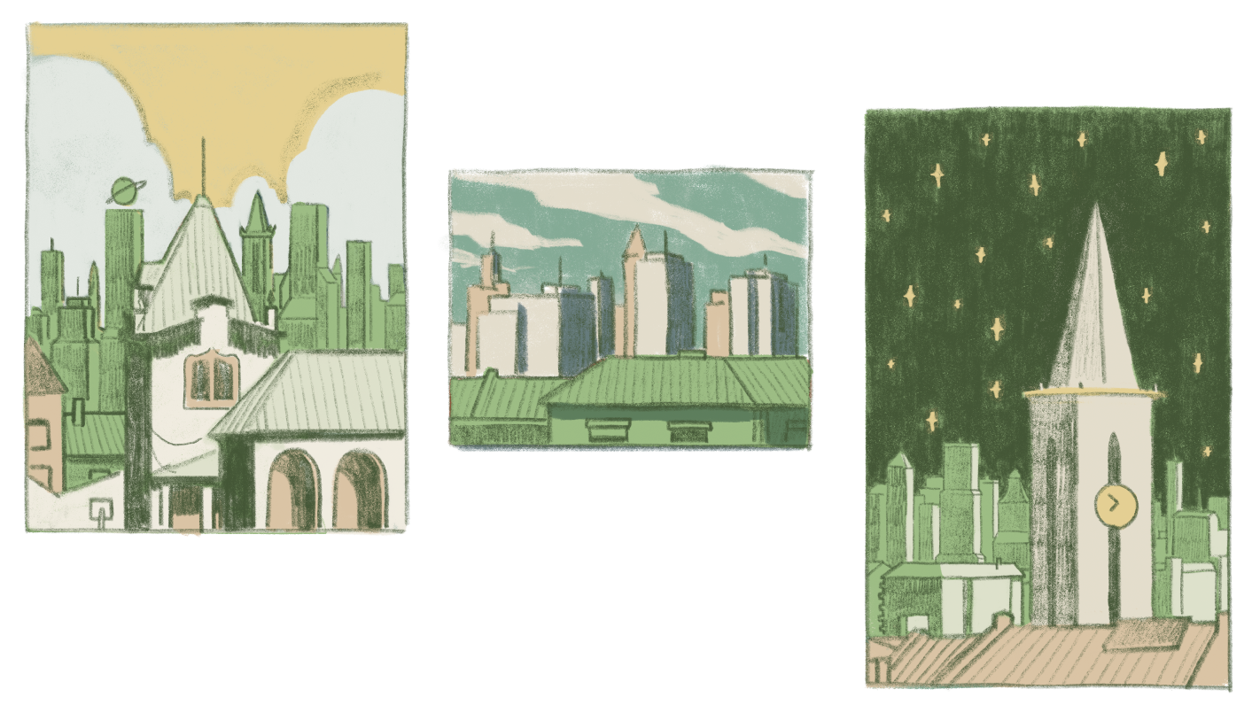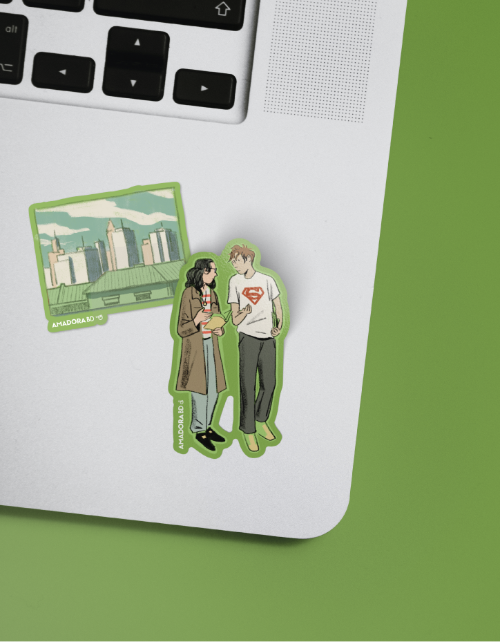 This is conveyed both through the people, the readers, and through the landscapes, which in the foreground depict more typical scenes of Amadora, while the background introduces a fantastical layer that alludes to the skyscrapers of “Metropolis”.